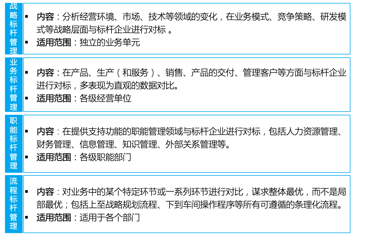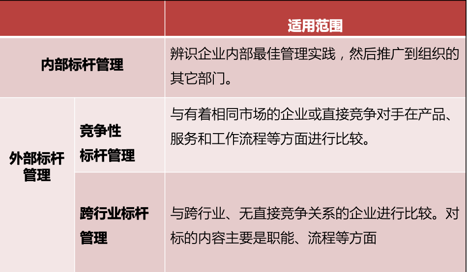 标杆管理 来源:SBTI 分类:标杆管理 标杆管理与企业流程再造、战略联盟一起,并称为20世纪90年代全球三大管理方法。是企业将自己的产品、服务和经营管理方式,不断与行业内或者行业外优秀企业的最佳实践进行比较,找出差距,制定措施,并实现持续改进的一种系统方法。标杆管理是种先进且重要的管理方式,是一系列科学的方法和工具,是一种(以人为中心,追求完美)的思维方式和企业文化,也是一套完整的管理体系。 思博创新对于标杆管理有着独到的见解,按照对象和内容划分标杆管理的类型: 按对标对象划分 按对标内容划分 标杆管理的价值 非常感谢您垂询SBTI 如果想了解更多服务 联系我们