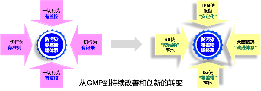 6)经营管理、品牌形象远不及国际先进水平, 缺乏在国际医药市场具有代表性的重磅产品。 严重阻碍我国医药产业做大做强,“走出去”参与国际竞争的“绊脚石”和“拦路虎”。 药企通过了GMP认证只意味着企业能合法合规的生产药品了,并不代表这些药企能够生存无忧,源于以下几个原因: 1、药品产能过剩,淘汰的企业又以中药企业居多,生产规模小,这些药企即使退出(部分可能被收购、重组),对整体供应没有显著的影响,供大于求的大格局不会改变,因此残酷的市场竞争并不会减弱,药企能否有效生存光靠GMP认证是解决不了的; 2、国际药企巨擘在中国有占据大部分中高档药品市场,国内药企的边际利润普遍偏低; 3、新版GMP要求软、硬件升级,带来额外的成本;原材料成本、人工成本、环保成本等持续上涨也使国内药企面临成本的压力越来越大; 4、由于多数属于仿制药,国产药信赖度较差,其质量和有效性还有很大的改善空间; 思博创新在医药行业的实施经验 从GMP到持续改善和创新的转变