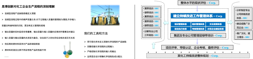 截止2022年底,思博创新与国内外20多家行业领先的化工企业建立战略合作关系,并协助企业部署实施精益六西格玛,大抵覆盖如下几个方面: